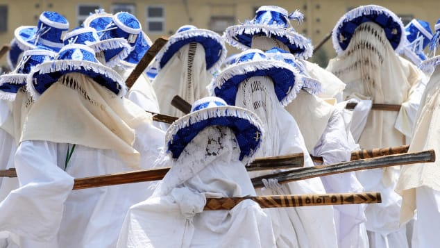 Masquerades are a huge aspect of Nigerian culture.These masked costumed figures are considered to embody the spirits, and serve as a fundamental part of Nigerian pre-colonial religious tradition.Nowadays they double up as entertainment and appear during weddings and festivals, particularly at Christmas time.Nigeria has over 250 ethnic groups, each with its own masquerade. The masks and costumes are visually striking.They can be made from a variety of materials such as grass, animal horns and teeth, and the young men who wear them sometimes cover their limbs in black palm oil to mesmerizing and scary effect.The masquerades travel through the villages, performing dances, acrobatics and reciting incantations.Chasing terrified villagers with bows and arrows or whips is also part of the tradition, so get ready to move your feet.