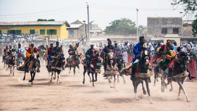 The annual Durbar festival is the cultural highlight of Nigeria’s Islamic north.This visual extravaganza is celebrated by thousands of peoples, mainly from the Hausa-Fulani ethnic groups, in multiple cities at the end of Ramadan.Followed by a parade that takes place in the city of Kano at the Emir’s Palace, it’s become a longstanding tourist attraction.The Emir’s sons, noblemen and regiments show their loyalty by trooping past on horses, accompanied by musicians.Each royal household has its own unique costume, made up of billowing robes and turbans that glitter in every color under the sun.Wearing black leather gloves, the princes raise a “power” fist as they bounce past the Emir.Being polygamous, the Emirs have literally dozens of sons and every one of them takes part, from the middle-aged to the toddlers. Counting them all is part of the fun.