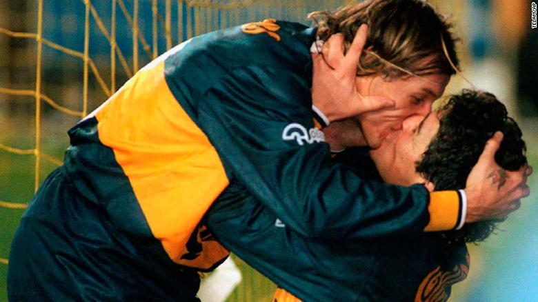 Photos: Soccer legend Diego MaradonaMaradona kisses his Boca Juniors teammate Claudio Caniggia after a goal against rival River Plate in 1996. Maradona finished out his playing career at Boca, where he starred in the early 1980s before moving to Europe.Hide Caption17 of 27