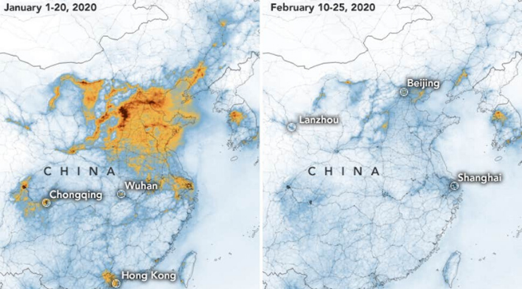 The maps released by NASA show the change in nitrogen dioxide levels before and after the quarantine. Nitrogen dioxide is a toxic emission from factories, power plants, and vehicles.