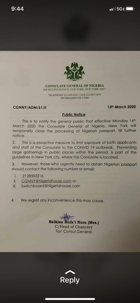 Nigeria’s diplomatic missions in Washington, New York and Atlanta, United States, have suspended passport interviews and biometric data capture over the coronavirus crisis.