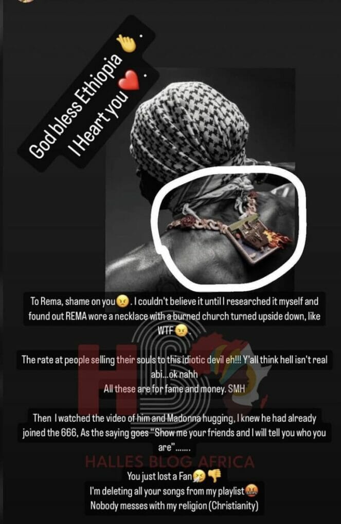 “To Rema, shame on you. I couldn’t believe it untill researched it myself and found out REMA wore a necklace with a burned church turned upside down, like