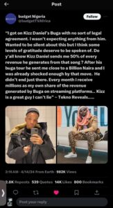 Recently, a social media post on X formally known as Twitter claimed Tekno revealed in an interview his profound gratitude towards Kizz Daniel for continuously giving him(Tekno) a share of the generated revenue from hit song ‘Buga’ which amounted to billions.