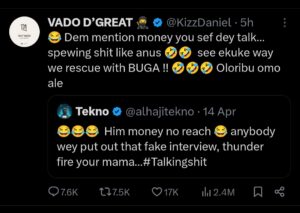 Reacting to Kizz Daniel’s post, Tekno fired back;